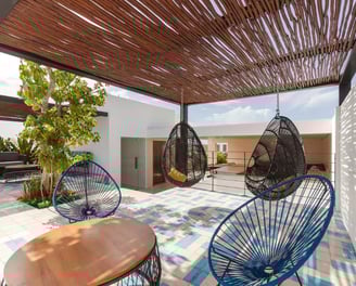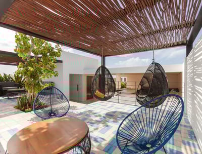 Terraza privada con zona lounge, hamacas colgantes y pérgolas de madera.