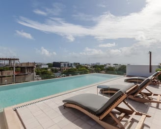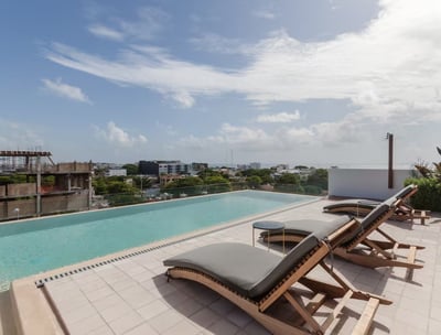 Alberca infinity en rooftop con vista panorámica al skyline de Playa del Carmen.